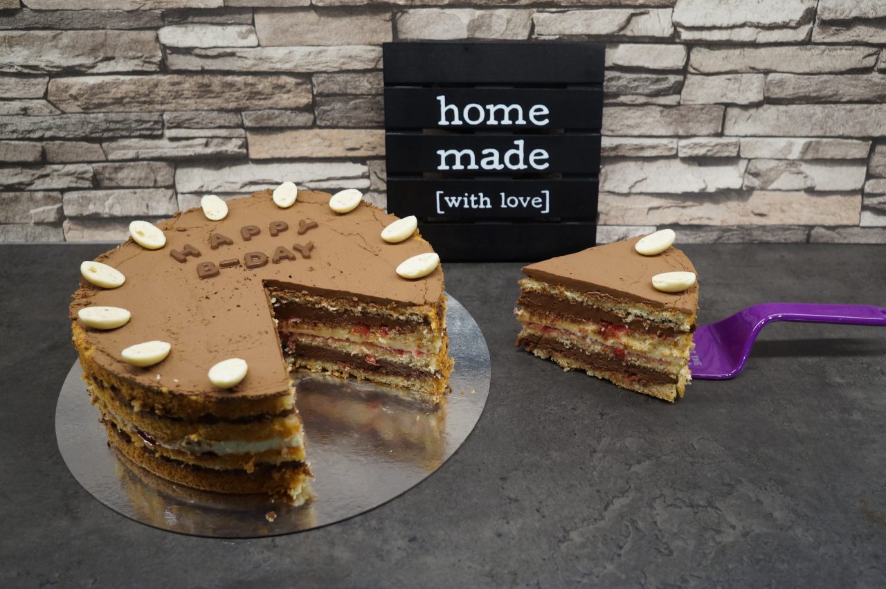 7. Mit dem letzten Biskuit abschließen und die restliche Schoko-Ganache verteilen und glatt streichen. Danach im Kühlschrank kühl stellen.