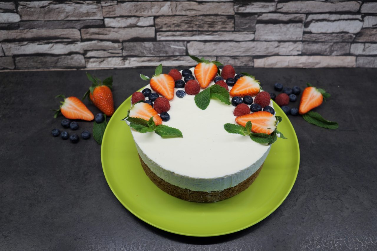 - Wascht das Obst ab und dekoriert die Torte mit frischen Früchten und Minze. Danach wird der Tortenring mit einem Tortenringmesser