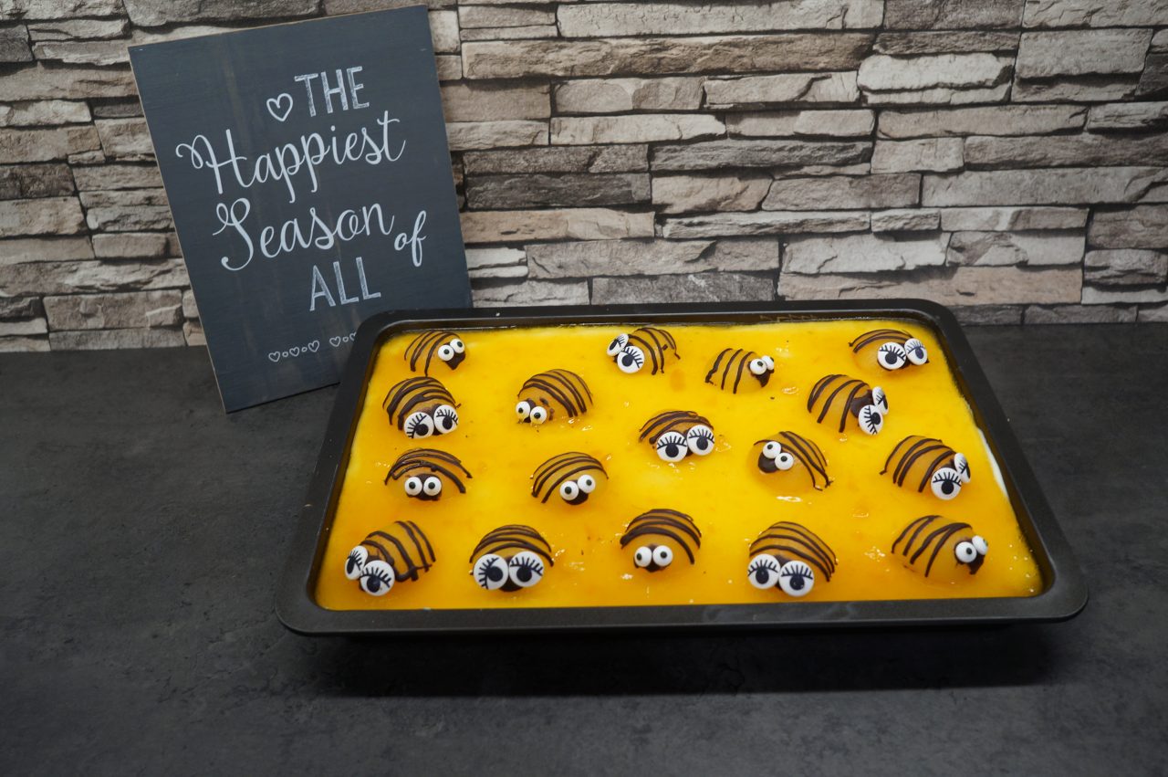 Dieser Bienen-Aprikosen Kuchen ist auf jedem Kindergeburtstag der absolute Hingucker. Durch die Zuckeraugen sehen die Bienchen richtig niedlich aus, oder was meint ihr? Der Kuchen besteht aus einem Biskuitteig, einer Vanille-Schmand-Creme und einem Aprikosen-Fruchtspiegel. Zum Rezept einfach weiterlesen 😀