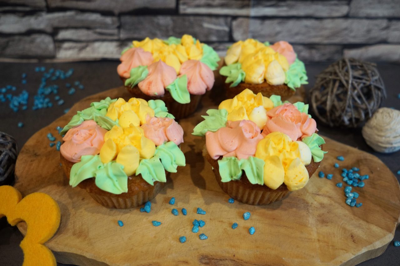 Blumen sind doch zu jeder Jahreszeit etwas schönes, oder? Warum nicht direkt mal essbare auf einen Cupcake zaubern? Keine Sorge mit der richtigen Tülle könnt ihr ganz einfach schöne Blumen und Blätter auf einen Cupcake spritzen, denn die Form wird durch die Tülle schon gegeben. Probiert es einfach aus. Am besten verwendet ihr eine Buttercreme, die euch am besten schmeckt und färbt diese ein. Viel Spaß beim nachbacken. Ich denke nicht nur euch werden die bunten Cupcakes auf der Kaffeetafel ein Lächeln ins Gesicht zaubern 🙂