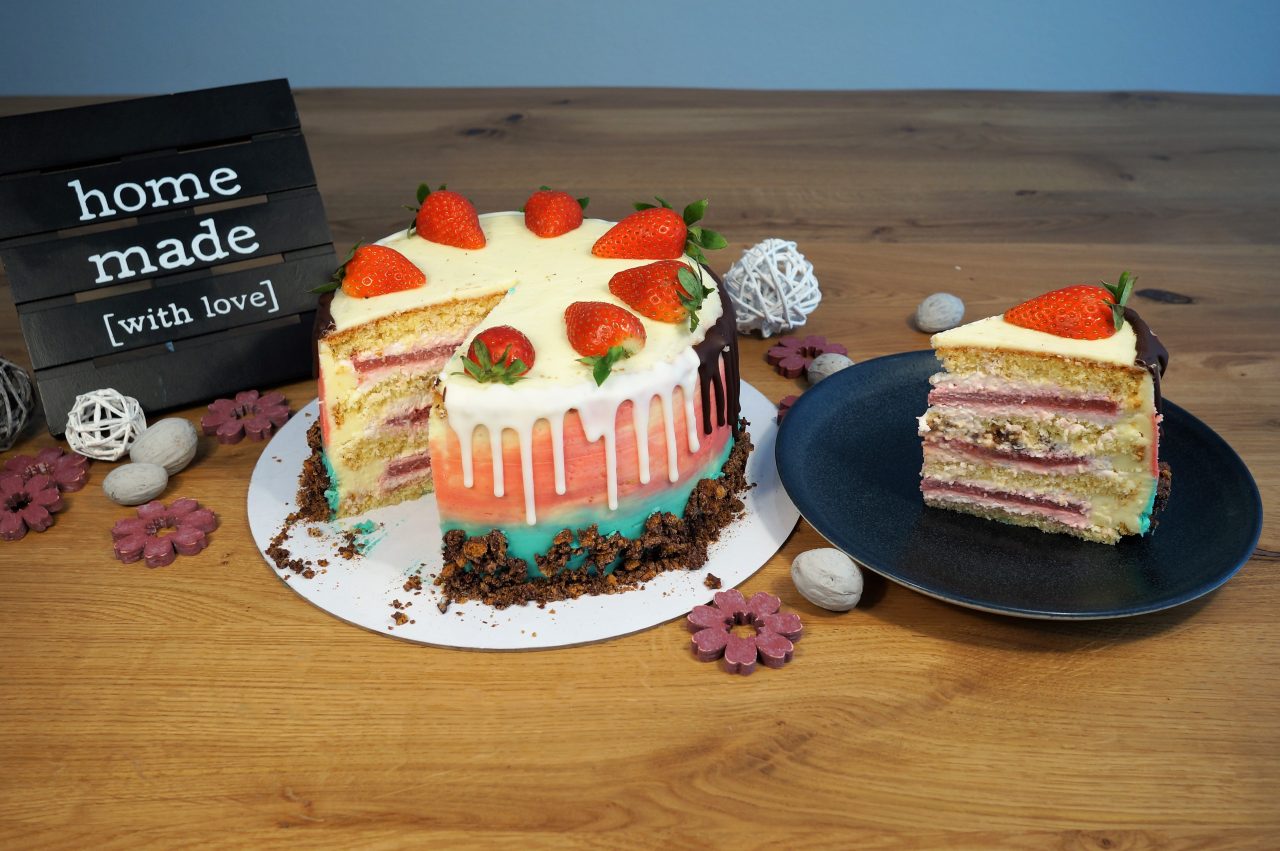 was kann es besseres geben als Erdbeeren und Torte? In dieser bunten Torte habe ich Erdbeer-Fruchteinlagen verarbeitet und natürlich wieder einen Crunsh hinzugefügt. Eigentlich ist die Torte ähnlich dem Erdbeer-Birthday-Cake. Ich habe mich hier aber für eine farbige Buttercreme entschieden, um auch optisch ein wenig aufzufallen. Mut zur Farbe würde ich sagen, viel Spaß beim nachbacken 🙂