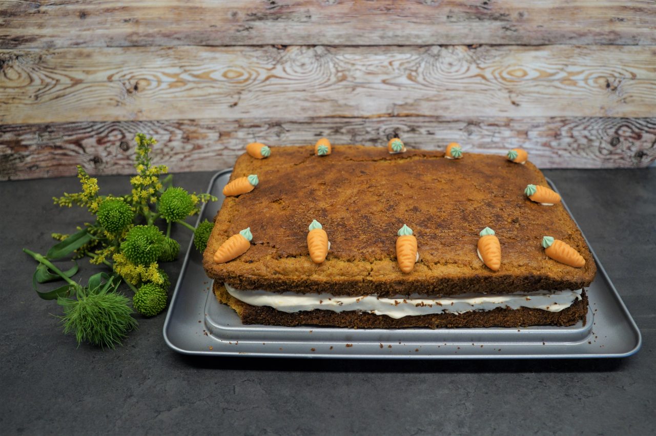 8. Wer möchte kann jetzt noch Marzipan-Möhren mit etwas von der Füllung auf dem Kuchen als Deko verteilen.
