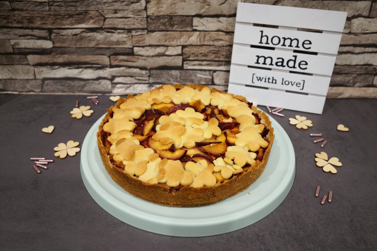 - Den Kuchen danach für 30 Minuten im Ofen fertig backen. Bitte schaut zwischendurch nach, da jeder Ofen etwas anders ist. Wichtig ist, dass der Mürbeteig gold-gelb durchgebacken ist.