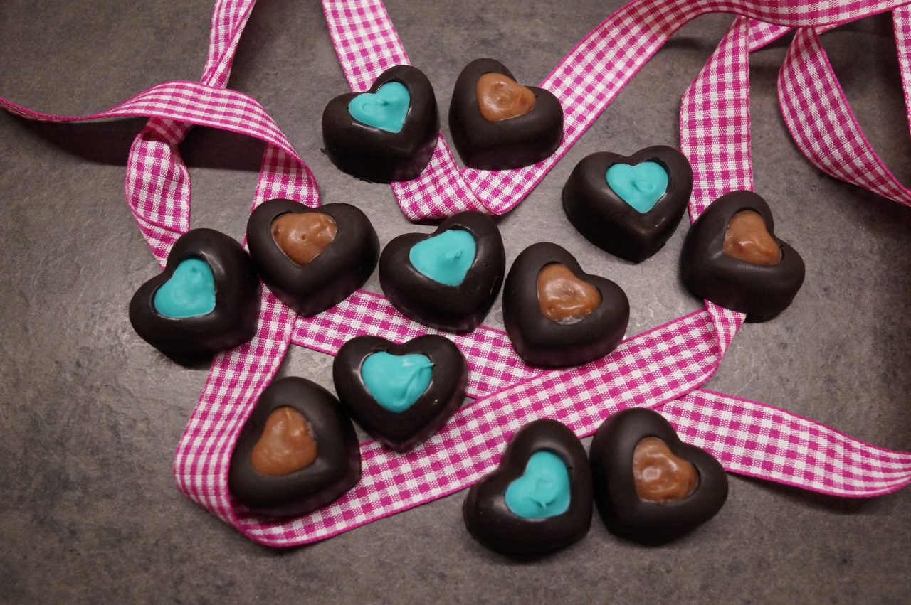 2. Mit Hilfe eines Löffels die Schokolade in die Silikon-Herzförmchen füllen und anschließend fest werden lassen. Ich habe insgesamt zwei verschiedene Sorten hergestellt und die Förmchen zwei Mal gefüllt.
