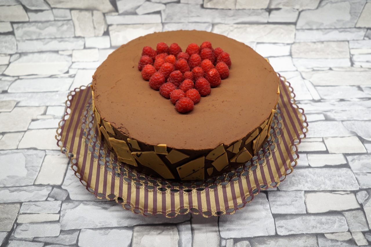 verwendet und diesen leicht in die Mitte der Torte gedrückt. So könnt ihr die Himbeeren entlang der Konturen verteilen und anschließend das Herz mit Himbeeren ausfüllen. Natürlich geht das auch ohne Schablone, aus der freien Hand.