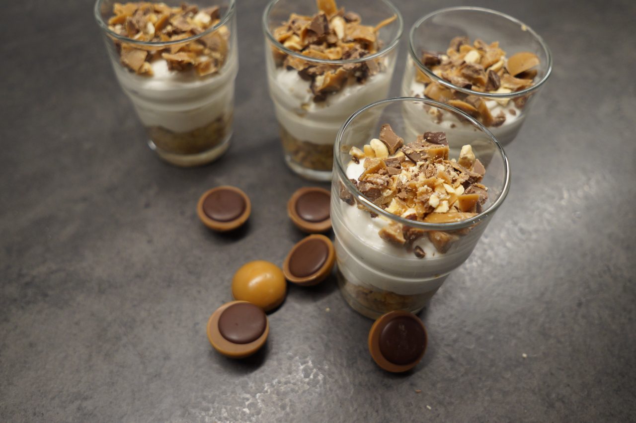 - Als letztes werden die klein gehackten Toffifees oben drüber gegeben. Wer möchte kann jetzt noch ein wenig Minze oder andere Schokolade zur weiteren Dekoration verwenden.