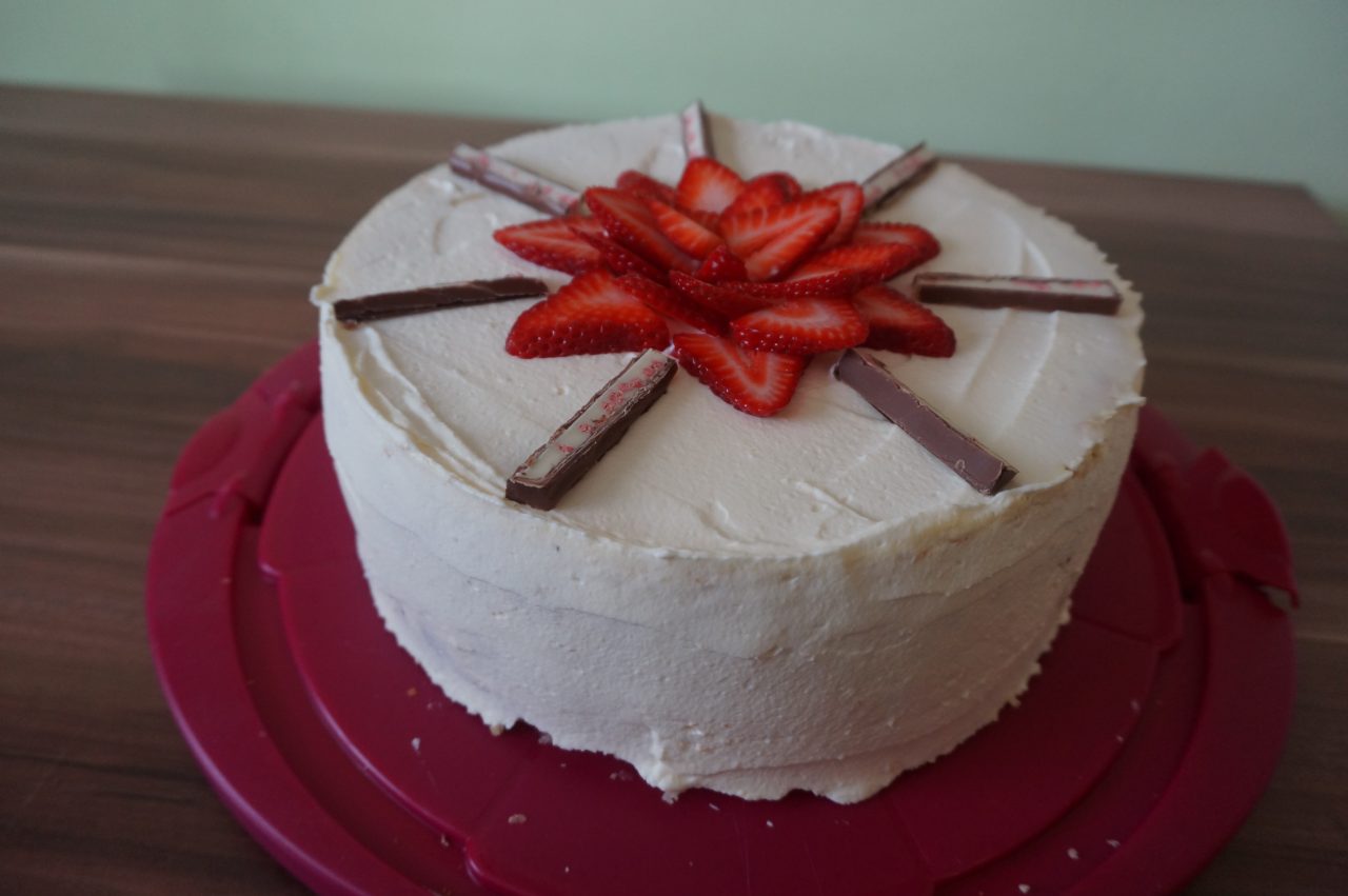 - Torte nun für eine Stunde gut kühlen. Anschließend den Springformrand lösen und die gesamte Torte mit der übrigen Creme einstreichen. Danach die Erdbeerscheiben von Aussen nach Innen dachziegelartig zu einer „Blume“ verteilen. Am besten beginnt ihr mit einem Kreis und arbeitet euch dann zur Mitte hin. Zuletzt werden die Erdbeer-Joghurt Schokoladen-Riegel halbiert und auf die Torte gegeben.