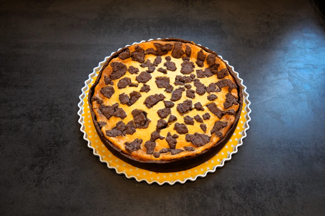 - Für die Füllung die Eier mit dem Zucker und Vanille-Extrakt verrühren, danach die Sahne, Quark und den Schmand hinzugeben, das Vanille-Pudding Pulver, die flüssige Butter/ oder das Öl und die geriebene Zitronenschale oder Zitronenpaste unterrühren. Alles so lange verrühren bis eine gebundene Masse entstanden ist. Die Füllung auf den Schoko-Boden geben. Wenn der Rand zu hoch geworden ist, mit einem Messer gerade abschneiden. Den restlichen Mürbeteig nun in kleine Stücke „zupfen“ und auf der Käsekuchen-Creme verteilen.